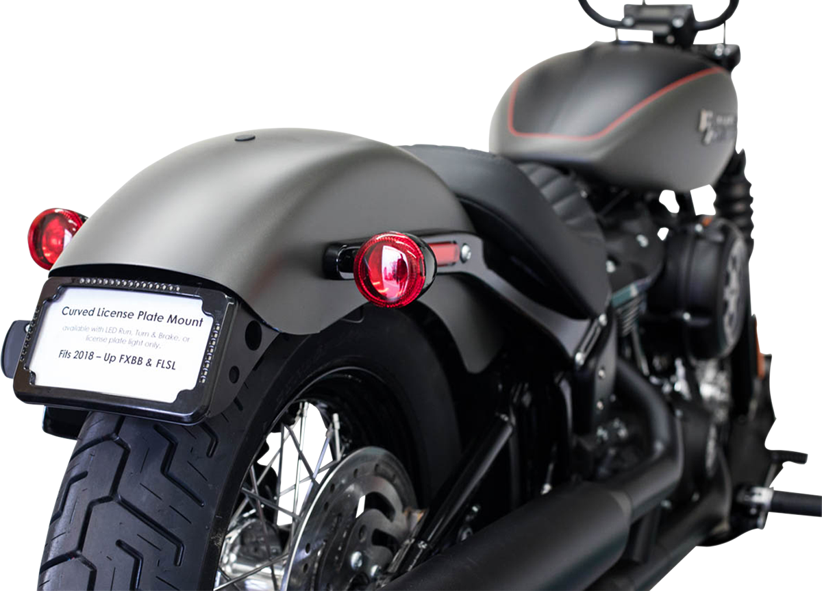 - Available with either curved, Slick Signal license plate frame with LED run, turn, brake and plate light or curved frame with license plate light only