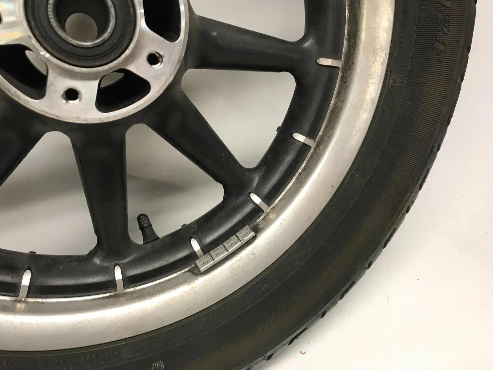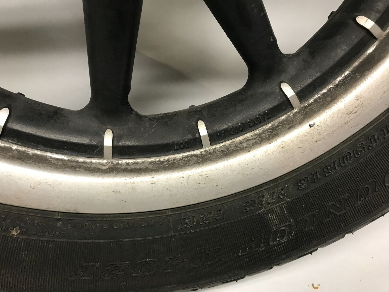 This item is used and shows normal signs of wear. Tire has some tread left and rims hold air well. Please see pictures for details